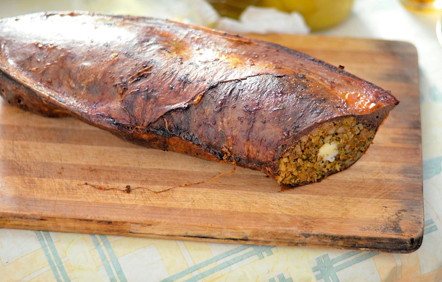 It is a cow’s spleen, stuffed with a seasoned mixture of ground meat, rice, herbs, spices, and … unspecified “offal.” The mixture is sewn shut and slow-roasted, then sliced and served.