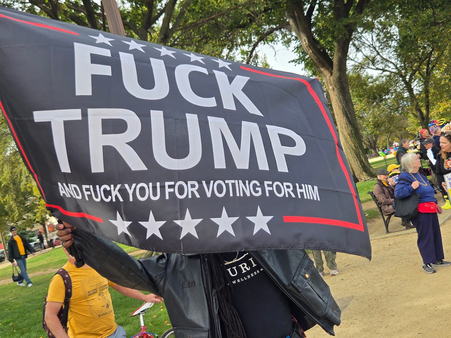 The best costume I saw out there was one worn by a tall man in a spangly Uncle Sam hat and the body of a chicken with an enormous, globular feathered waddly behind. He wore a T-shirt with a particularly unflattering image of Donald Trump, and this slogan: