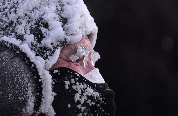 I lived in South Minneapolis for sixteen years, and ran year-round. As long as I had a good base layer, wind pants and jacket, hat, mitts (not gloves) and Vaseline on my face, I could run miles and miles without discomfort. The key is to keep moving but avoid breaking a sweat— after awhile the moving keeps you just warm enough. I would start a run with a bandana on my face but it would ice over as I got warm, and after I pulled it down the Vaseline kept my skin alive even in -70 windchills.