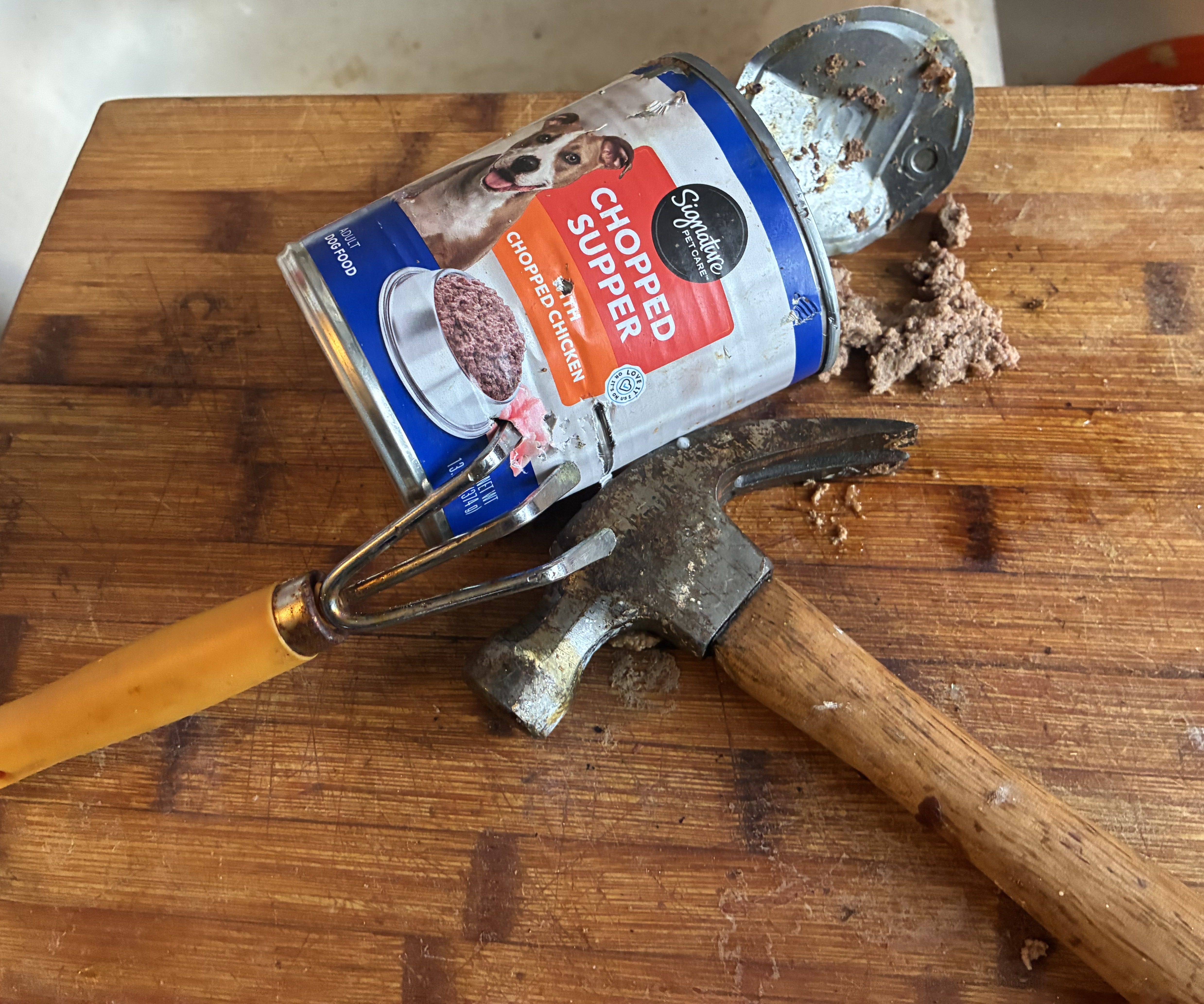 Then I went to get breakfast for Lexi. It was a can of dog food, the one above. The pop-top came off in my hand, with the lid still sealed tighter than Ghislaine Maxwell. So I grabbed a can opener, but it didn’t work because the lid was recessed because it was built to be popped off, not box-cuttered into, so I grabbed the nearest penetrating tool I could find, a garden claw, and hacked away at the can, and when that didn’t work I got a butcher knife and tried to carve my way into it and when that didn’t work I grabbed a fucking hammer and hammered in the top, and chopped chicken dinner exploded all over and I hate Donald Trump.